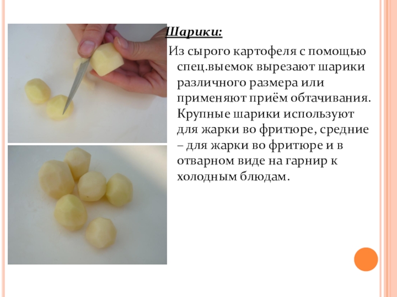 или применяют приём обтачивания. Крупные шарики используют для жарки во фритюре, средние – для жарки во фритюре и в отварном виде на гарнир к холодным блюдам.