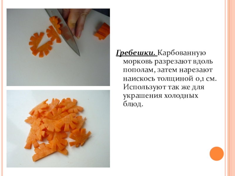 Слайд 24Гребешки. Карбованную морковь разрезают вдоль пополам, затем нарезают наискось толщиной 0,1