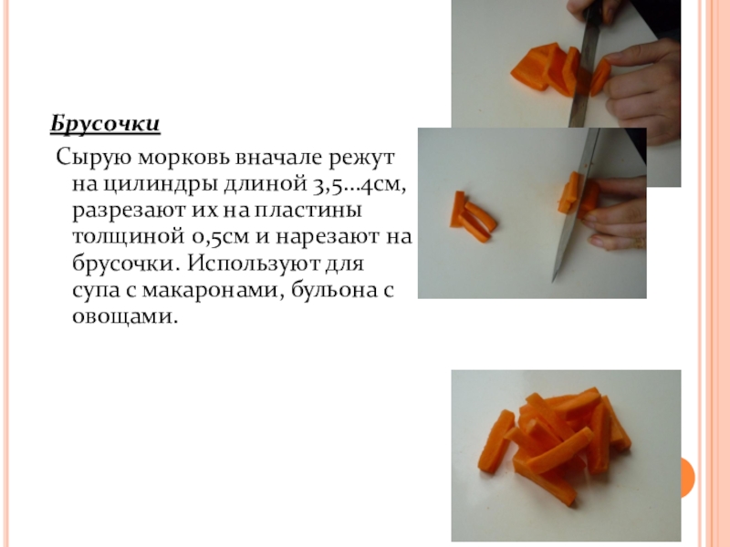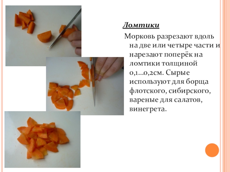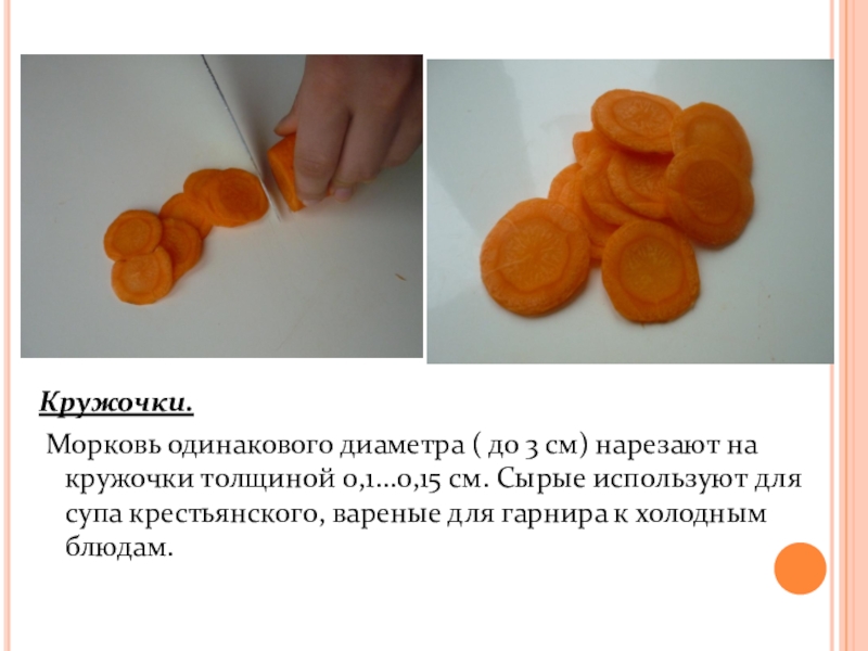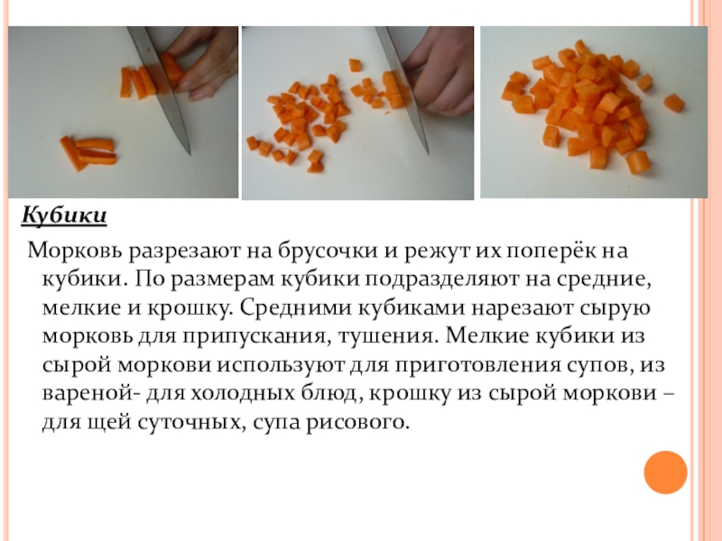 По размерам кубики подразделяют на средние, мелкие и крошку. Средними кубиками нарезают сырую морковь для припускания, тушения. Мелкие кубики из сырой моркови используют для приготовления супов, из вареной- для холодных блюд, крошку из сырой моркови – для щей суточных, супа рисового.