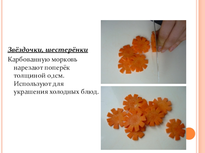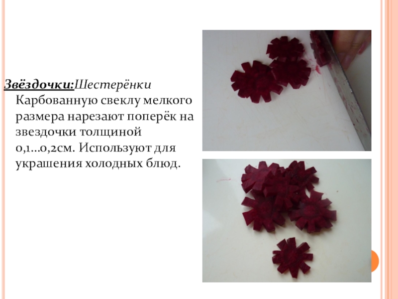 Слайд 28Звёздочки:Шестерёнки Карбованную свеклу мелкого размера нарезают поперёк на звездочки толщиной 0,1…0,2см.