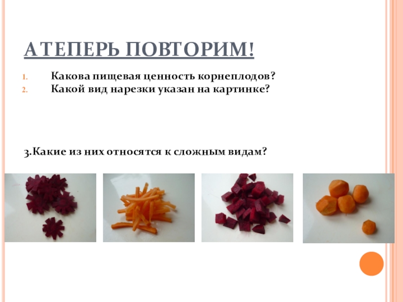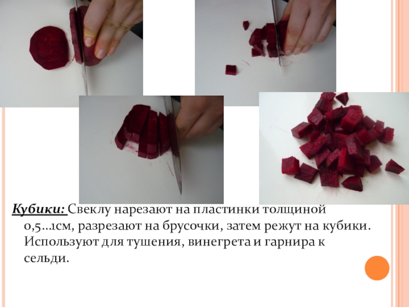 Слайд 27Кубики: Свеклу нарезают на пластинки толщиной 0,5…1см, разрезают на брусочки, затем