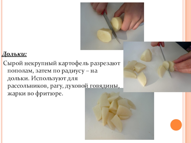 дольки. Используют для рассольников, рагу, духовой говядины, жарки во фритюре.