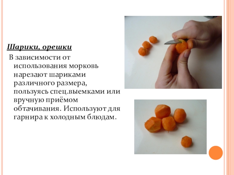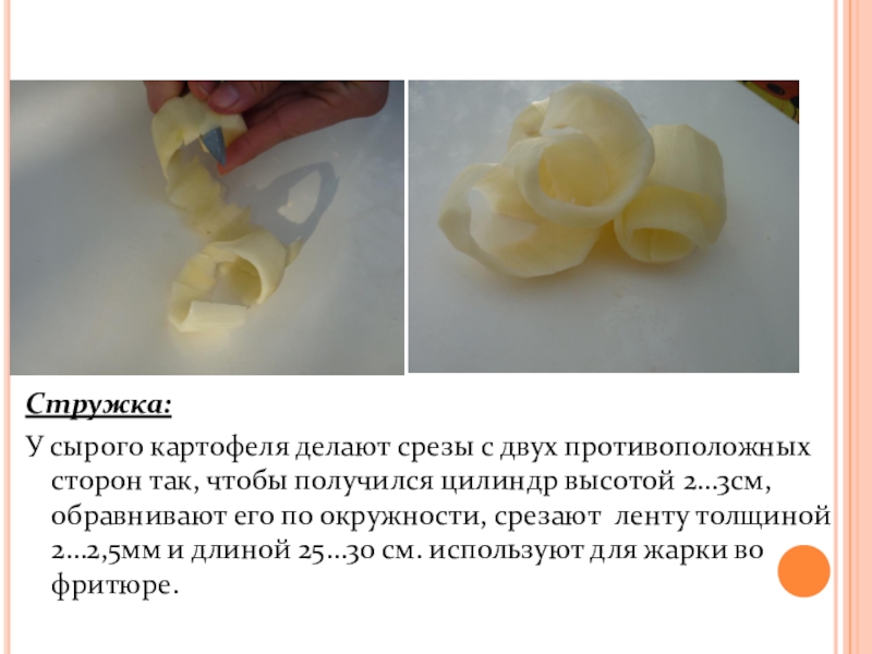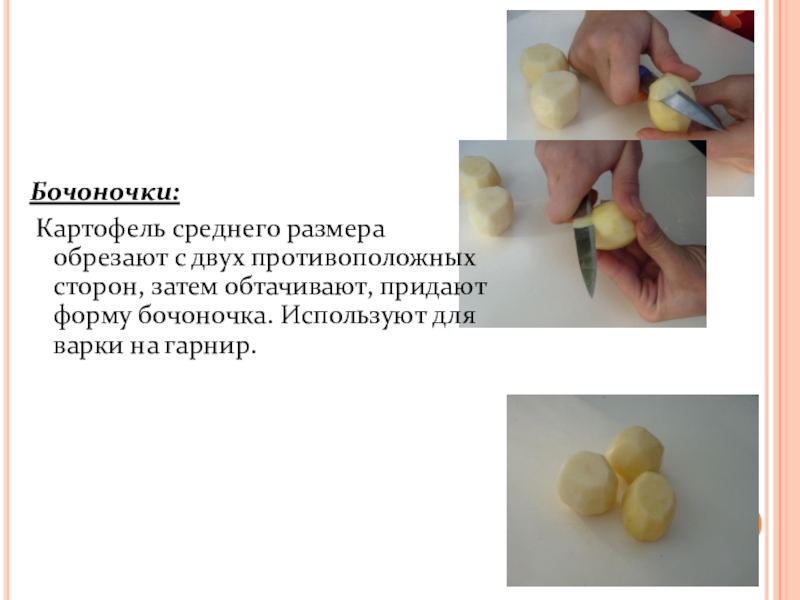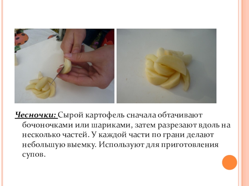 Слайд 11Чесночки: Сырой картофель сначала обтачивают бочоночками или шариками, затем разрезают вдоль