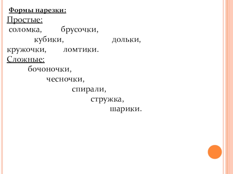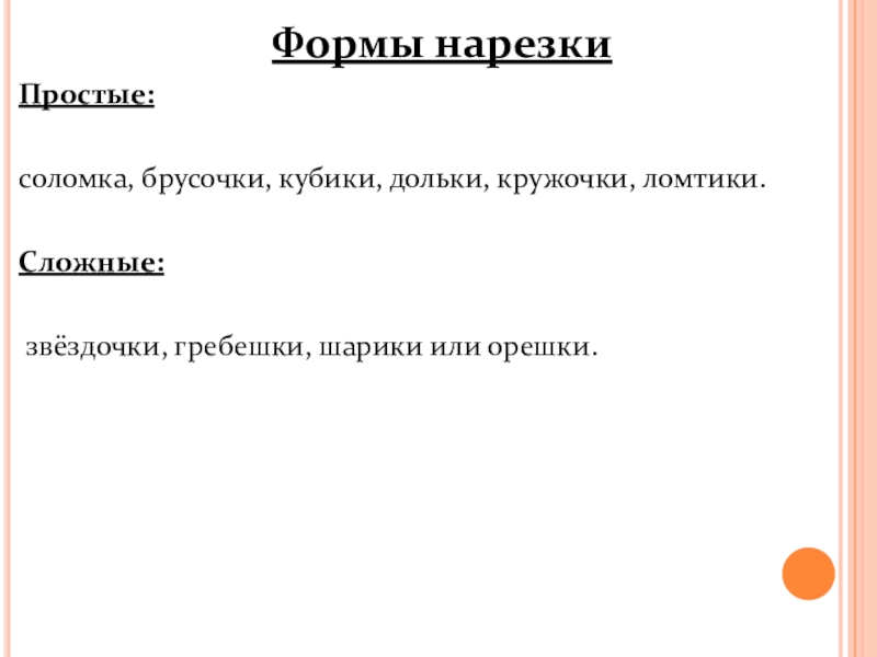 соломка, брусочки, кубики, дольки, кружочки, ломтики.