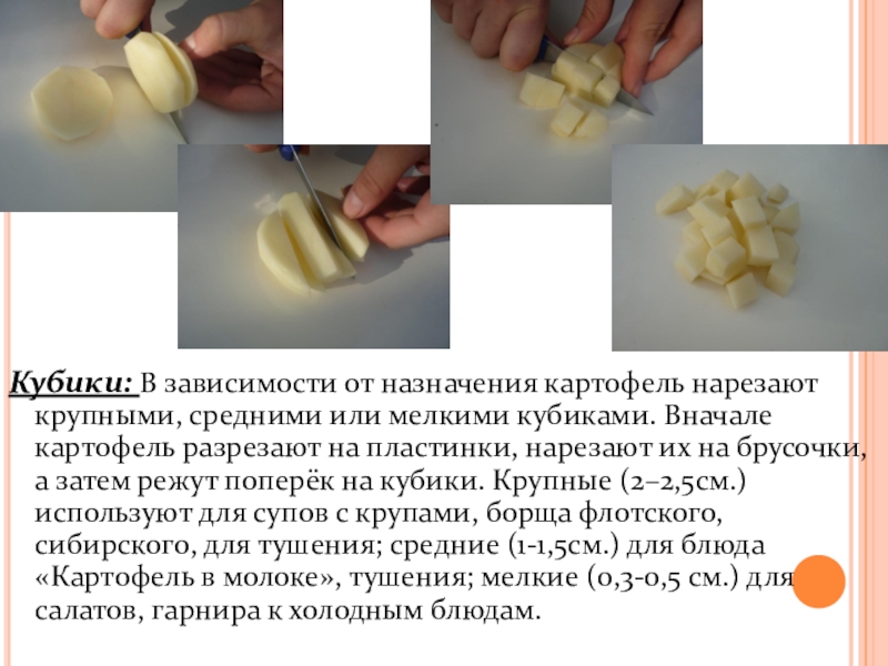 Слайд 6Кубики: В зависимости от назначения картофель нарезают крупными, средними или мелкими
