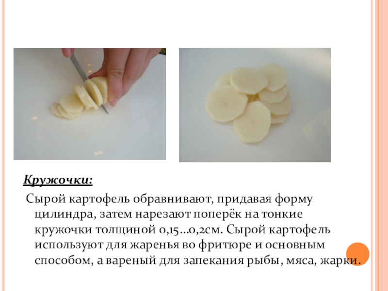 тонкие кружочки толщиной 0,15…0,2см. Сырой картофель используют для жаренья во фритюре и основным способом, а вареный для запекания рыбы, мяса, жарки.