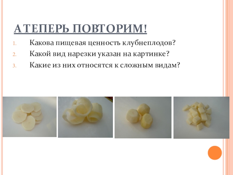Слайд 4 ФОРМЫ НАРЕЗКИ КАРТОФЕЛЯ.