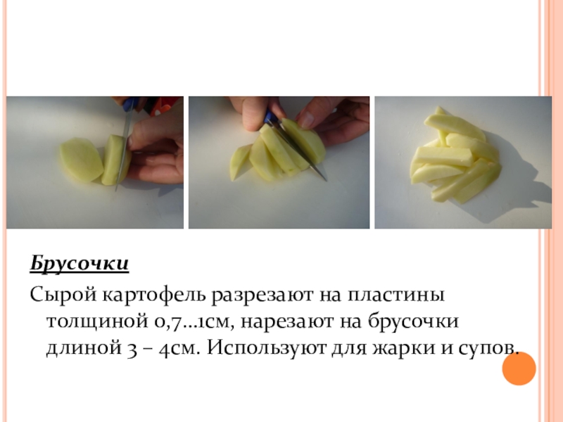 Сырой картофель разрезают на пластины толщиной 0,7…1см, нарезают на брусочки длиной