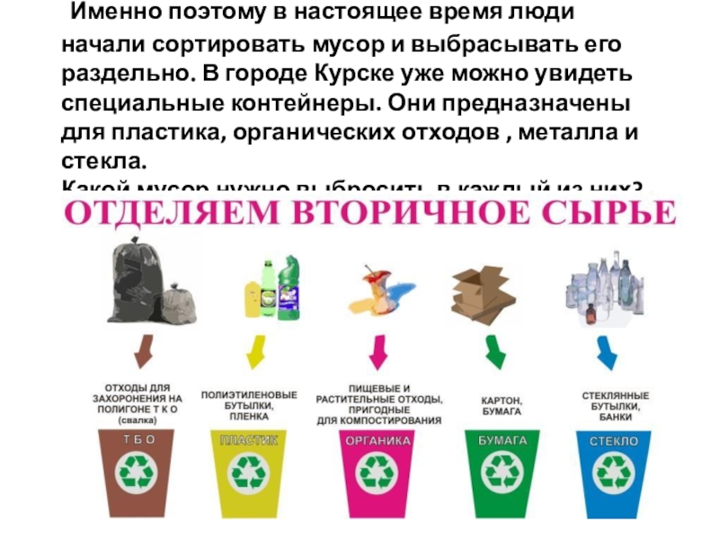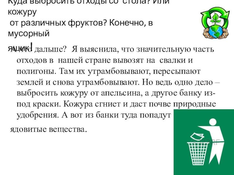А что дальше? Я выяснила, что значительную часть отходов в нашей стране вывозят на свалки и полигоны. Там их утрамбовывают, пересыпают землей и снова утрамбовывают. Но ведь одно дело – выбросить кожуру от апельсина, а другое банку из-под краски. Кожура сгниет и даст почве природные удобрения. А вот из банки туда попадут
