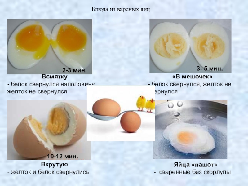 Яйца варят всмятку, «в мешочек» и вкрутую. Удобно делать это в яйцеварках, сотейниках, кастрюлях со вставными сетками. На десяток яиц расходуют 2,5 - 3 л воды.