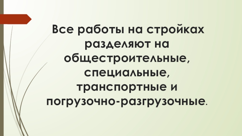 Слайд 2 Все работы на стройках разделяют на общестроительные, специальные, транспортные и