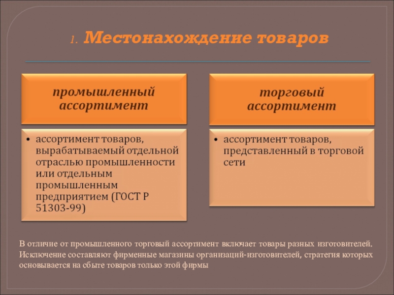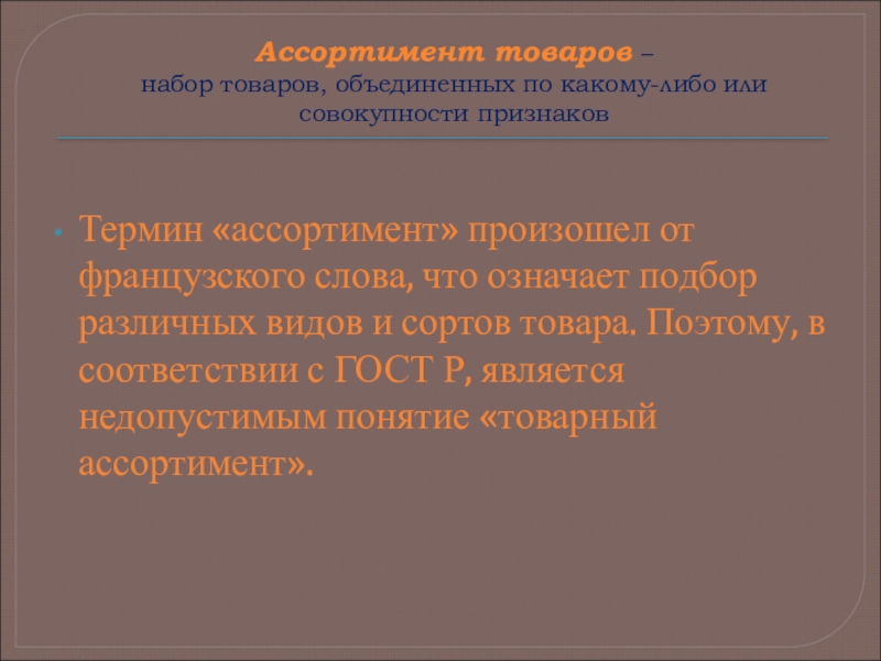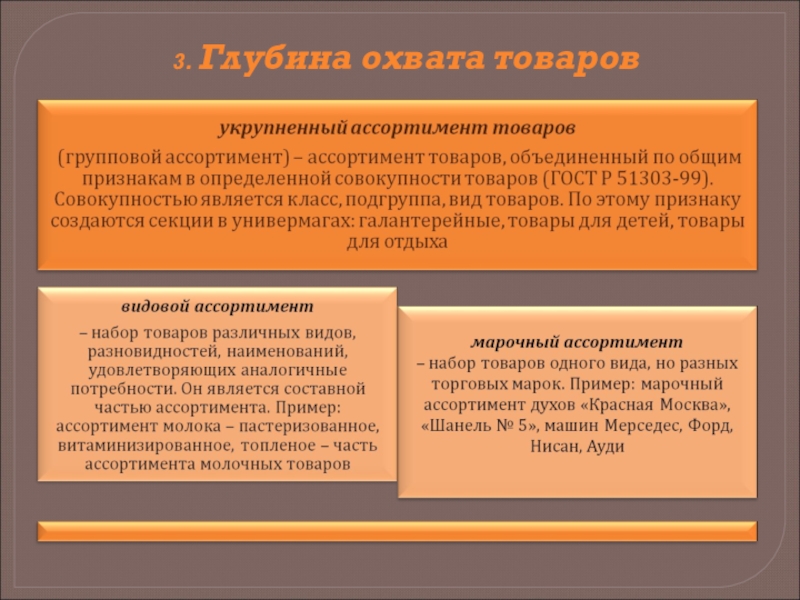 развернутый ассортимент (внутригрупповой ассортимент) – ассортимент товаров, представленный их разновидностями (ГОСТ 51303-99). Он включает большое количество подгрупп, видов, разновидностей, наименований, в том числе марочных Такой ассортимент встречается в специализированных магазинах, причем количество групп однородных товаров может быть небольшим