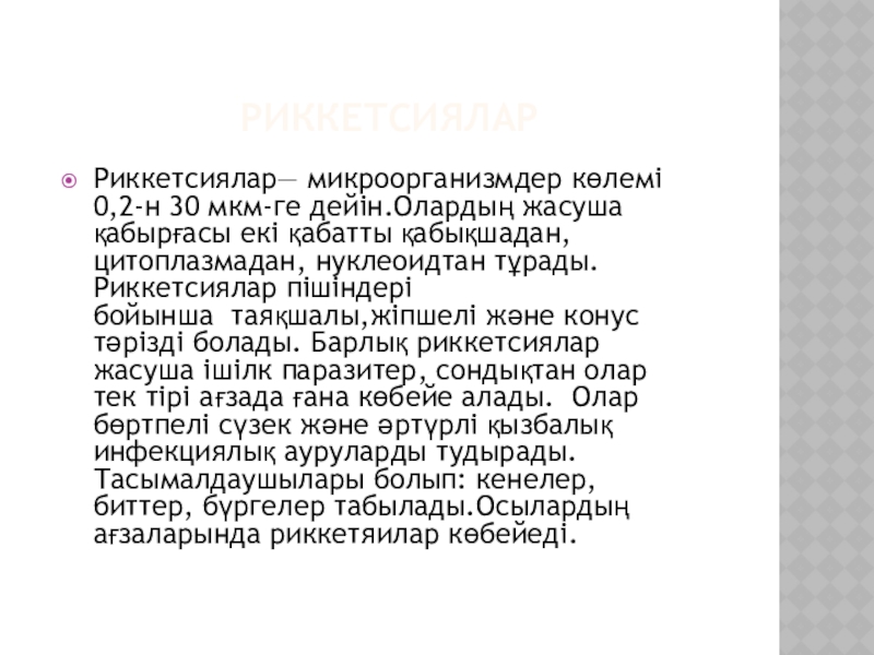 РиккетсияларРиккетсиялар— микроорганизмдер көлемі 0,2-н 30 мкм-ге дейін.Олардың жасуша қабырғасы екі қабатты қабықшадан, цитоплазмадан, нуклеоидтан тұрады.   Риккетсиялар
