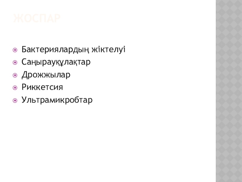 Жоспар Бактериялардың жіктелуіСаңырауқұлақтарДрожжыларРиккетсияУльтрамикробтар