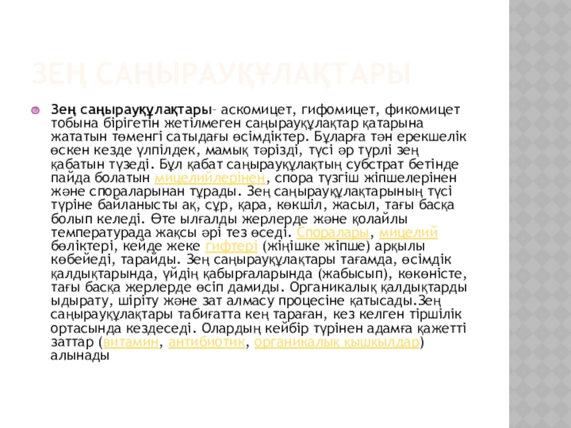 Зең саңырауқұлақтарыЗең саңырауқұлақтары– аскомицет, гифомицет, фикомицет тобына бірігетін жетілмеген саңырауқұлақтар қатарына жататын төменгі сатыдағы өсімдіктер. Бұларға тән