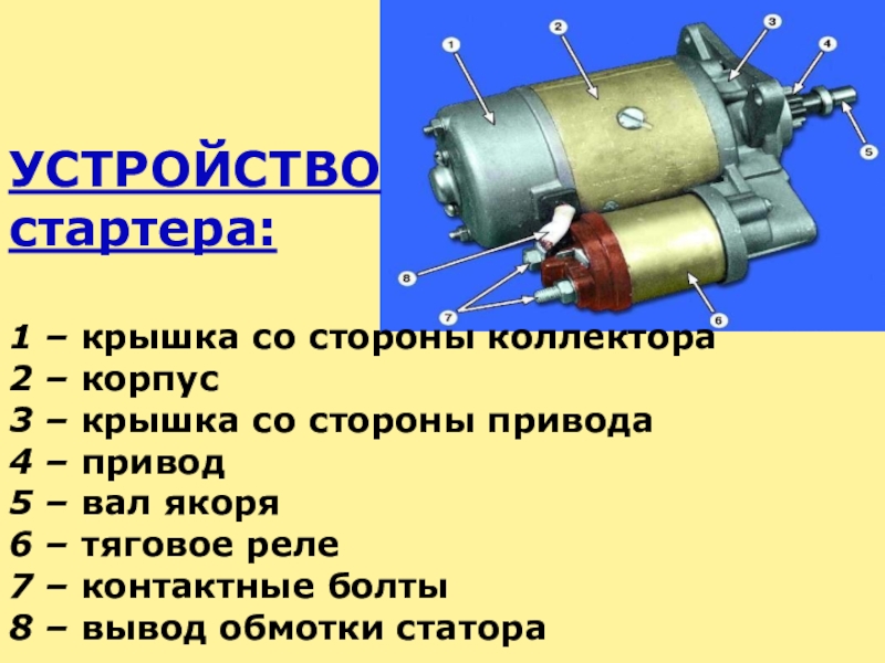 со стороны привода 4 – привод 5 – вал якоря 6 – тяговое реле 7 – контактные болты 8 – вывод обмотки статора