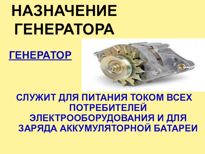 НАЗНАЧЕНИЕ ГЕНЕРАТОРАГЕНЕРАТОРСЛУЖИТ ДЛЯ ПИТАНИЯ ТОКОМ ВСЕХ ПОТРЕБИТЕЛЕЙ ЭЛЕКТРООБОРУДОВАНИЯ И ДЛЯ ЗАРЯДА АККУМУЛЯТОРНОЙ БАТАРЕИ