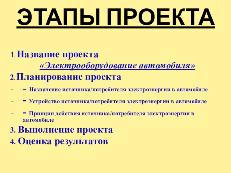 ЭТАПЫ ПРОЕКТА1. Название проекта«Электрооборудование автомобиля»2. Планирование проекта- Назначение источника/потребителя электроэнергии в автомобиле- Устройство источника/потребителя электроэнергии в автомобиле-