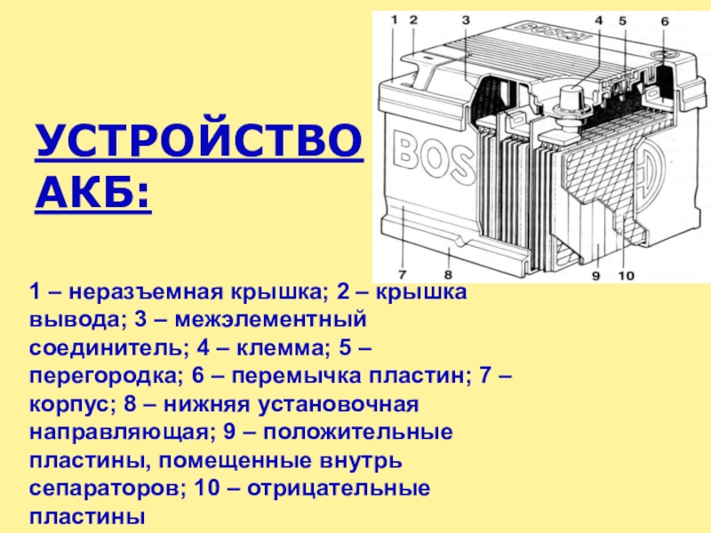 межэлементный соединитель; 4 – клемма; 5 – перегородка; 6 – перемычка пластин; 7 – корпус; 8 – нижняя установочная направляющая; 9 – положительные пластины, помещенные внутрь сепараторов; 10 – отрицательные пластины