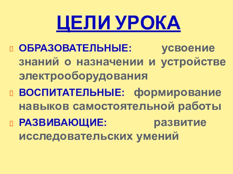 ЦЕЛИ УРОКАОБРАЗОВАТЕЛЬНЫЕ: усвоение знаний о назначении и устройстве электрооборудованияВОСПИТАТЕЛЬНЫЕ: формирование навыков самостоятельной работыРАЗВИВАЮЩИЕ: развитие исследовательских умений