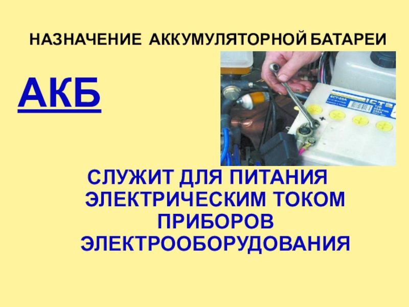НАЗНАЧЕНИЕ АККУМУЛЯТОРНОЙ БАТАРЕИАКБ СЛУЖИТ ДЛЯ ПИТАНИЯ ЭЛЕКТРИЧЕСКИМ ТОКОМ ПРИБОРОВ ЭЛЕКТРООБОРУДОВАНИЯ