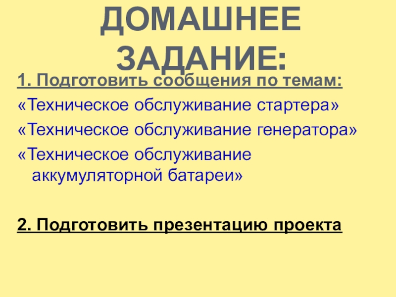 ДОМАШНЕЕ ЗАДАНИЕ:1. Подготовить сообщения по темам:«Техническое обслуживание стартера»«Техническое обслуживание генератора»«Техническое обслуживание аккумуляторной батареи»2. Подготовить презентацию проекта