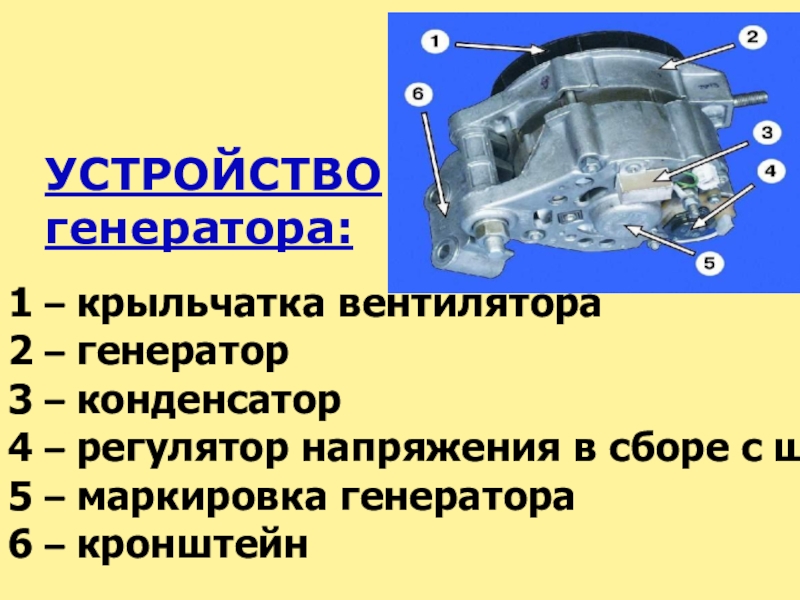 напряжения в сборе с щеткодержателем 5 – маркировка генератора 6 – кронштейн