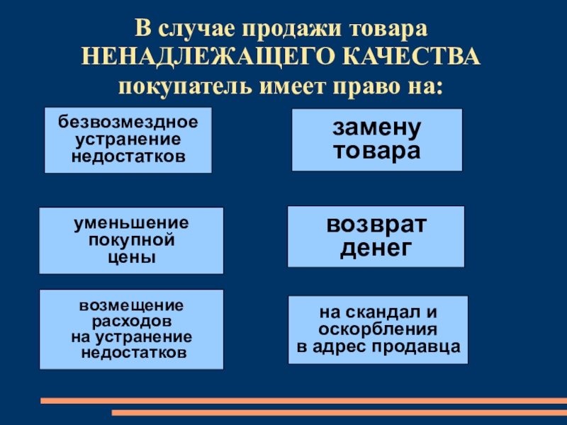 Слайд 17В случае продажи товара НЕНАДЛЕЖАЩЕГО КАЧЕСТВА покупатель имеет право на: