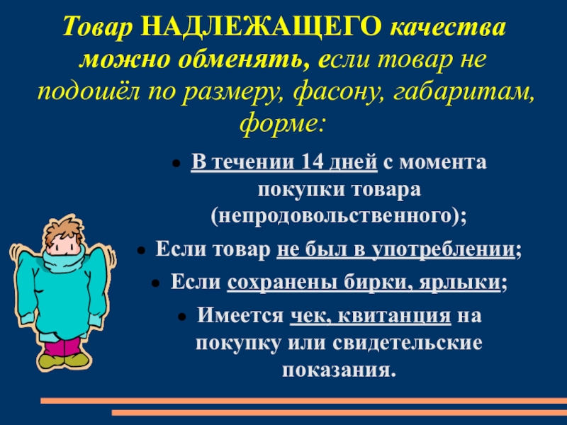 Слайд 19Товар НАДЛЕЖАЩЕГО качества можно обменять, если товар не подошёл по размеру,