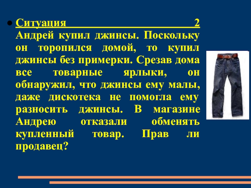 Андрей купил джинсы. Поскольку он торопился домой, то купил джинсы без примерки. Срезав дома все товарные ярлыки, он обнаружил, что джинсы ему малы, даже дискотека не помогла ему разносить джинсы. В магазине Андрею отказали обменять купленный товар. Прав ли продавец?