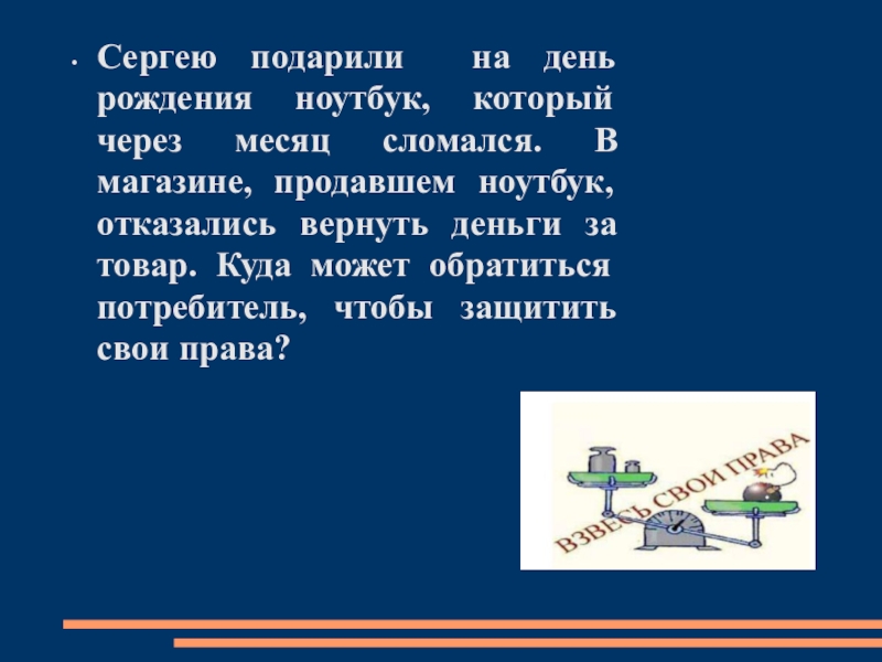 Слайд 34Сергею подарили на день рождения ноутбук, который через месяц сломался. В