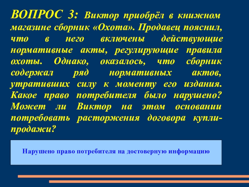 что в него включены действующие нормативные акты, регулирующие правила охоты. Однако, оказалось, что сборник содержал ряд нормативных актов, утративших силу к моменту его издания. Какое право потребителя было нарушено? Может ли Виктор на этом основании потребовать расторжения договора купли-продажи?