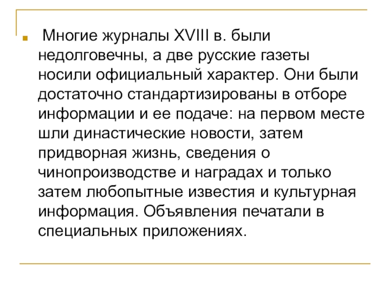 Слайд 16 Многие журналы XVIII в. были недолговечны, а две русские газеты
