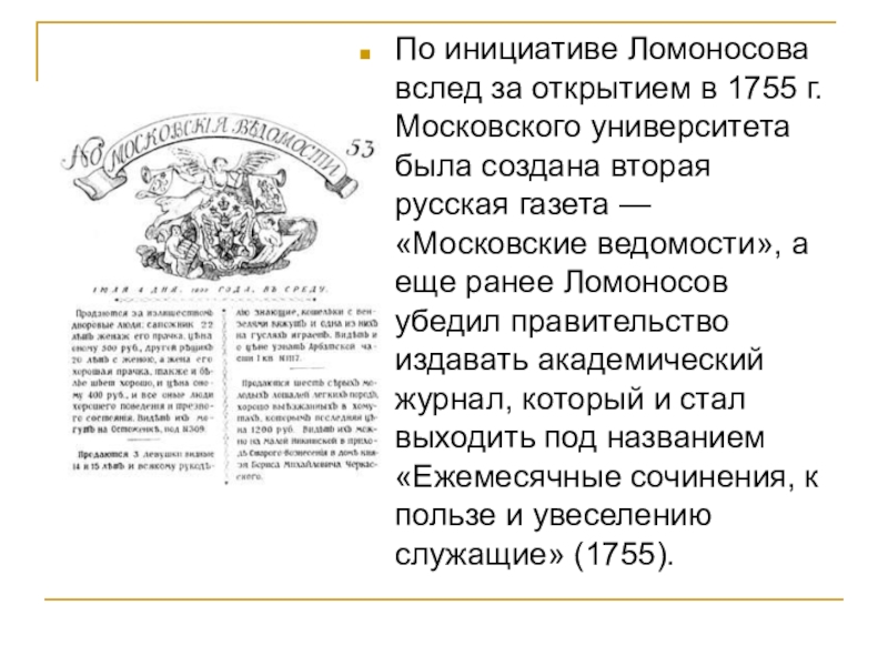 была создана вторая русская газета — «Московские ведомости», а еще ранее Ломоносов убедил правительство издавать академический журнал, который и стал выходить под названием «Ежемесячные сочинения, к пользе и увеселению служащие» (1755).