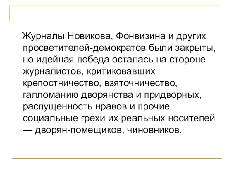 Слайд 22 Журналы Новикова, Фонвизина и других просветителей-демократов были закрыты, но