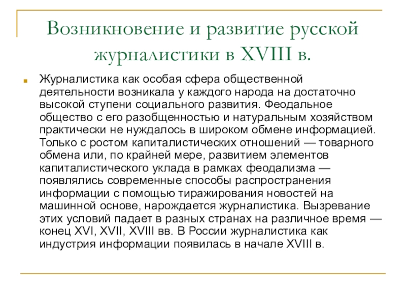 общественной деятельности возникала у каждого народа на достаточно высокой ступени социального развития. Феодальное общество с его разобщенностью и натуральным хозяйством практически не нуждалось в широком обмене информацией. Только с ростом капиталистических отношений — товарного обмена или, по крайней мере, развитием элементов капиталистического уклада в рамках феодализма — появлялись современные способы распространения информации с помощью тиражирования новостей на машинной основе, нарождается журналистика. Вызревание этих условий падает в разных странах на различное время — конец XVI, XVII, XVIII вв. В России журналистика как индустрия информации появилась в начале XVIII в.