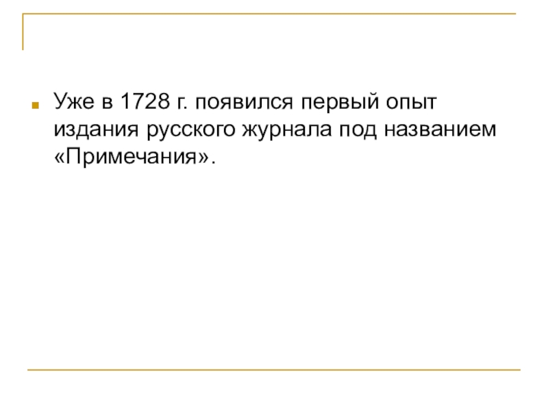 Слайд 12Уже в 1728 г. появился первый опыт издания русского журнала под