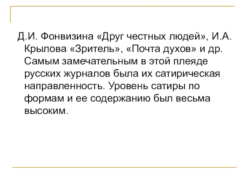 и др. Самым замечательным в этой плеяде русских журналов была их сатирическая направленность. Уровень сатиры по формам и ее содержанию был весьма высоким.