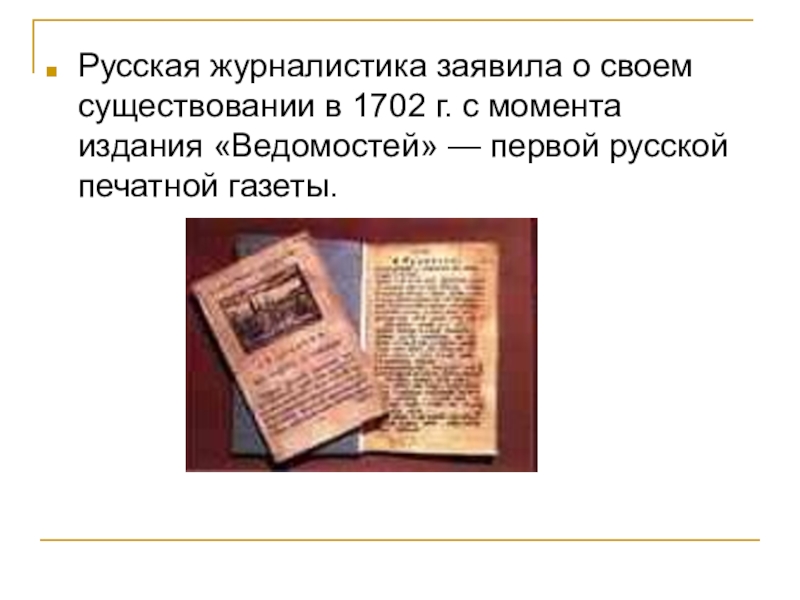 Слайд 5Русская журналистика заявила о своем существовании в 1702 г. с момента