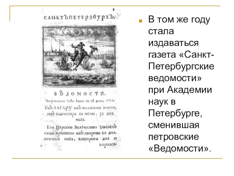 Слайд 13В том же году стала издаваться газета «Санкт-Петербургские ведомости» при Академии