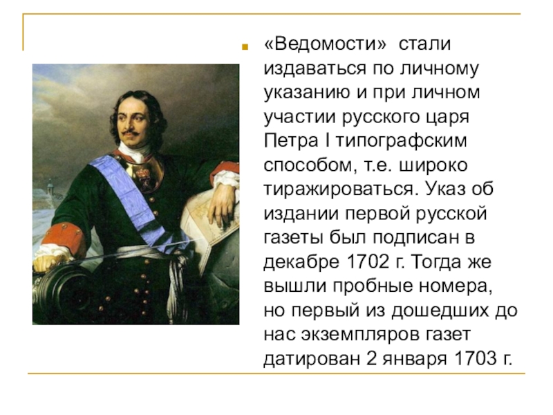 Слайд 7«Ведомости» стали издаваться по личному указанию и при личном участии русского