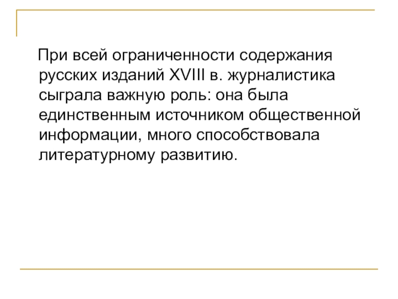 Слайд 23 При всей ограниченности содержания русских изданий XVIII в. журналистика