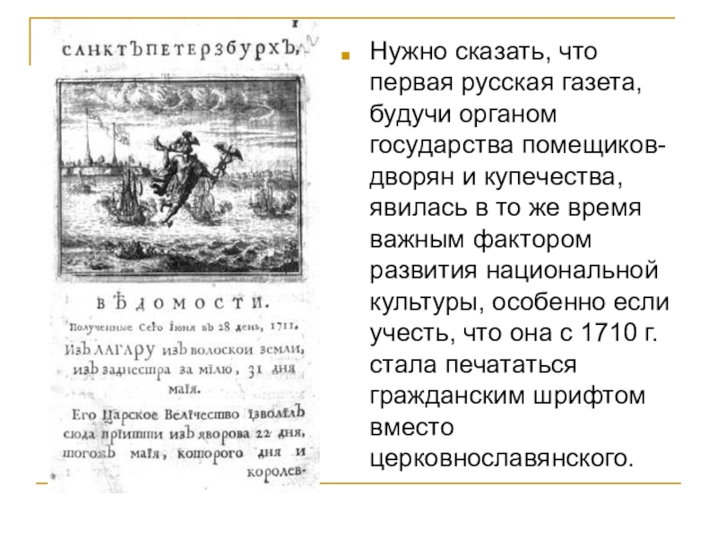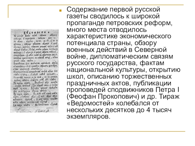 Слайд 8Содержание первой русской газеты сводилось к широкой пропаганде петровских реформ, много