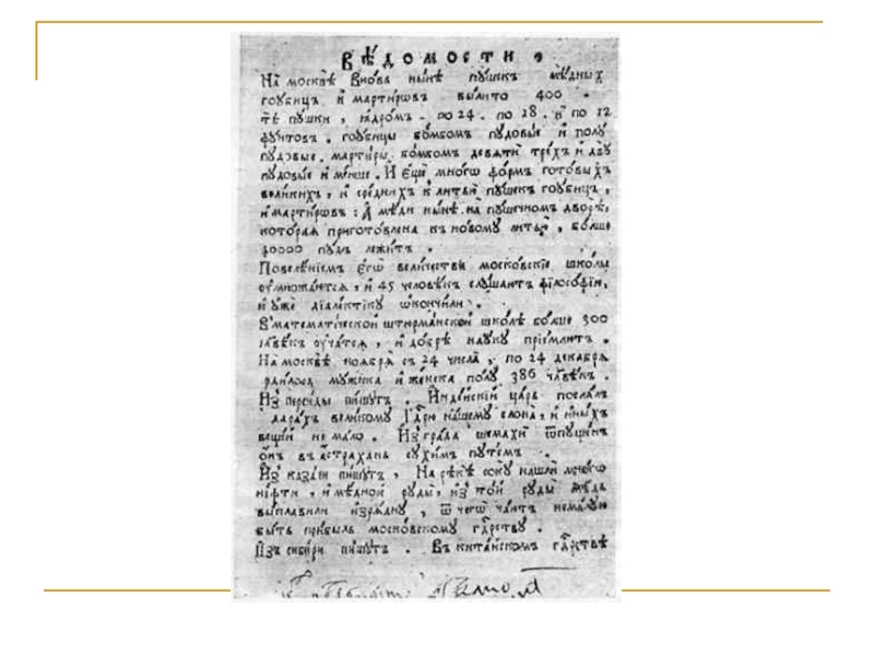 царя Петра I типографским способом, т.е. широко тиражироваться. Указ об издании первой русской газеты был подписан в декабре 1702 г. Тогда же вышли пробные номера, но первый из дошедших до нас экземпляров газет датирован 2 января 1703 г.