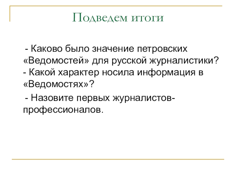 - Каково было значение петровских «Ведомостей» для русской