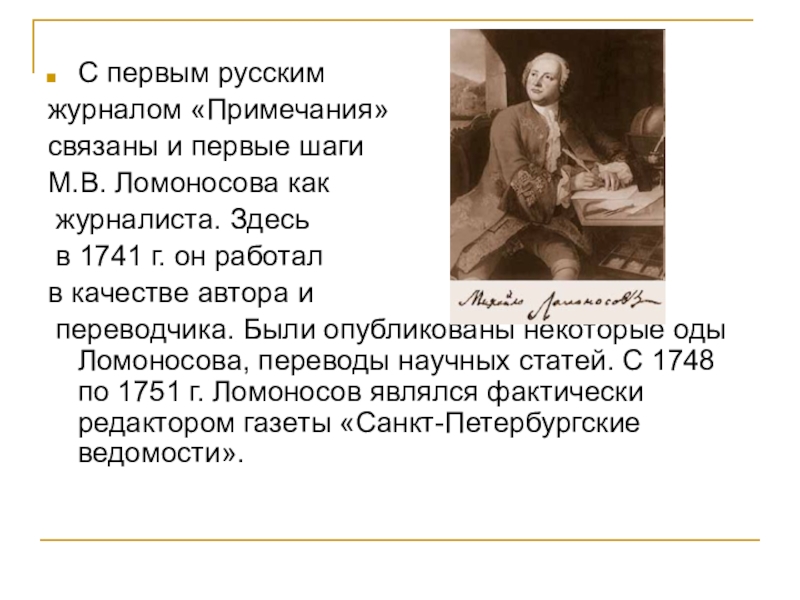 переводчика. Были опубликованы некоторые оды Ломоносова, переводы научных статей. С 1748 по 1751 г. Ломоносов являлся фактически редактором газеты «Санкт-Петербургские ведомости».