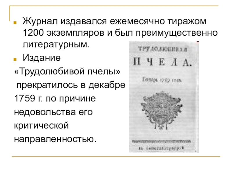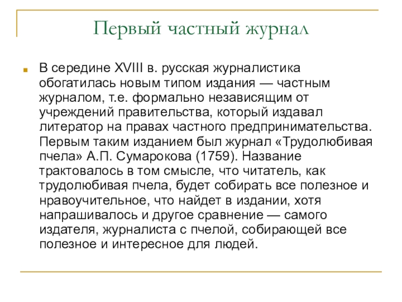 издания — частным журналом, т.е. формально независящим от учреждений правительства, который издавал литератор на правах частного предпринимательства. Первым таким изданием был журнал «Трудолюбивая пчела» А.П. Сумарокова (1759). Название трактовалось в том смысле, что читатель, как трудолюбивая пчела, будет собирать все полезное и нравоучительное, что найдет в издании, хотя напрашивалось и другое сравнение — самого издателя, журналиста с пчелой, собирающей все полезное и интересное для людей.