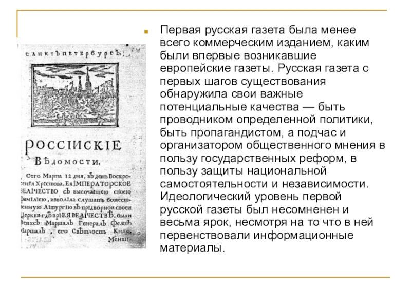 возникавшие европейские газеты. Русская газета с первых шагов существования обнаружила свои важные потенциальные качества — быть проводником определенной политики, быть пропагандистом, а подчас и организатором общественного мнения в пользу государственных реформ, в пользу защиты национальной самостоятельности и независимости. Идеологический уровень первой русской газеты был несомненен и весьма ярок, несмотря на то что в ней первенствовали информационные материалы.