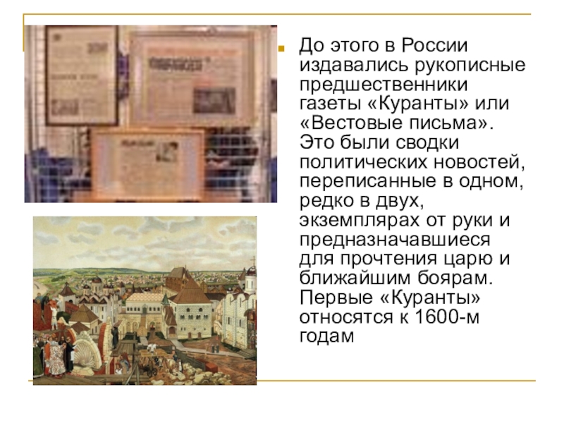 Слайд 6До этого в России издавались рукописные предшественники газеты «Куранты» или «Вестовые