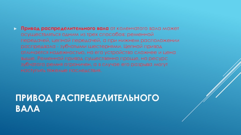 трех способов: ременной передачей, цепной передачей, а при нижнем расположении распредвала - зубчатыми шестернями. Цепной привод отличается надежностью, но его устройство сложнее и цена выше. Ременной привод существенно проще, но ресурс зубчатого ремня ограничен, а в случае его разрыва могут наступить тяжелые последствия.